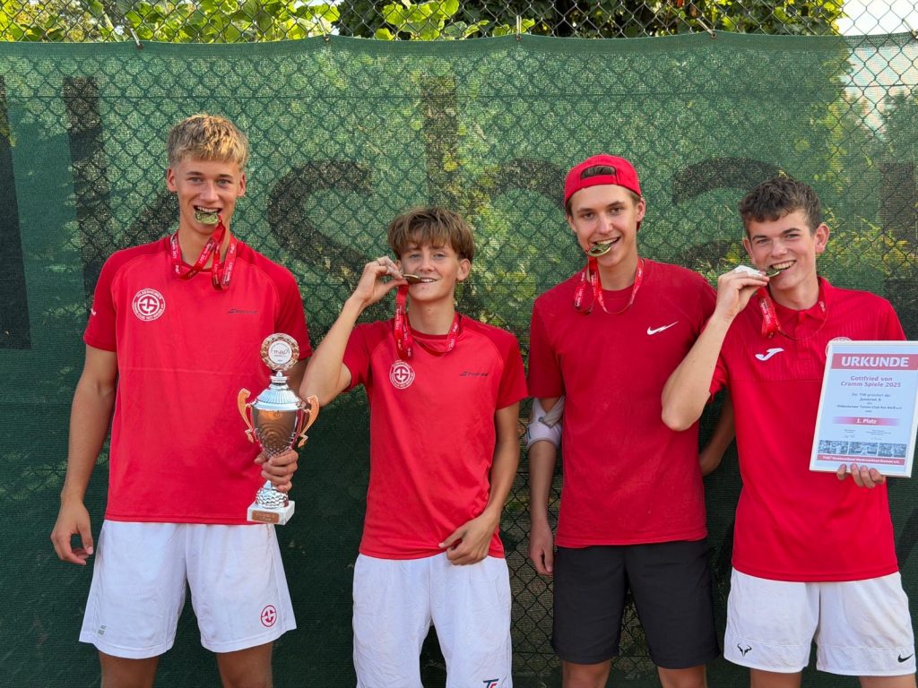 In einem packenden Herzschlag-Finale gegen die Titelverteidiger vom Braunschweiger THC haben Jonas Eilert, Maximilian Langguth (TC Alfeld), Nevio Ryll und Moritz Wagner die Niedersachsenmeisterschaft geholt. Herzlichen Glückwunsch zu der Spitzenleistung!